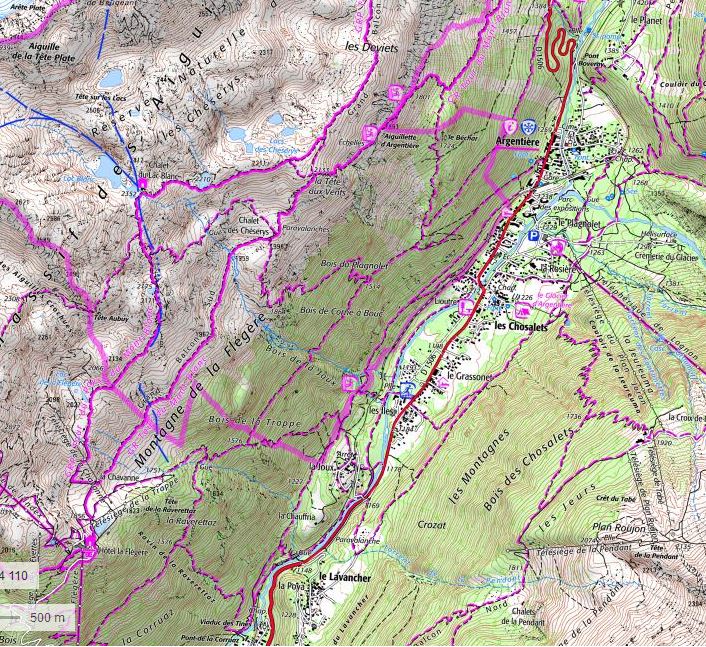 MapVeuillez imprimer le plan à grande échelle d'Argentière à partir de ce lien. Si vous ne souhaitez pas acheter la carte IGN Top 25, vous devrez imprimer la zone indiquée à droite (cliquez pour agrandir) au 1:25 000 de Geoportail. Vous devrez couvrir une zone qui comprend, au minimum, la station de téléphérique de la Flégère en bas à gauche, le lac Blanc en haut à gauche, le village d'Argentière en haut à droite et Le Lavancher en bas.