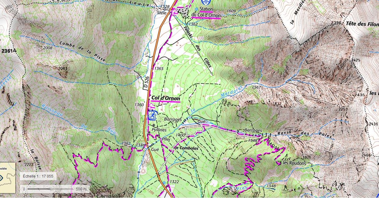 Pour le stage Bronze uniquement, merci d'imprimer la carte à grande échelle (1) et la la carte à grande échelle (2) de la zone au sud de Bourg d’Oisans. Vous devrez également imprimer la carte d'orientation sportive «Sportif» pour adultes qui est le deuxième des trois liens PDF sur cette page..Map Si vous voulez éviter d'acheter la carte IGN, vous pouvez imprimer les deux zones montrées à droite a l’échelle de 1:25 000. Vous aurez besoin de la zone au sud de Bourg le premier jour et la zone du col d'Ornon pour le deuxième jour.