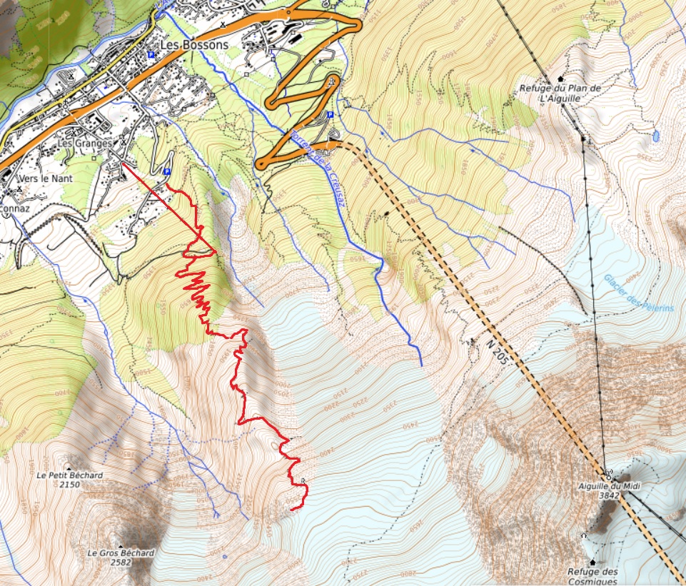 The walk starts by the ski jump (tremplin) in Les Bossons, or you can take the Bossons chairlift from a little lower down the hill. There is parking in both places. If you are using public transport, Chamonix bus number 2 stops by the chairlift. You’ll want the Glacier des Bossons stop.