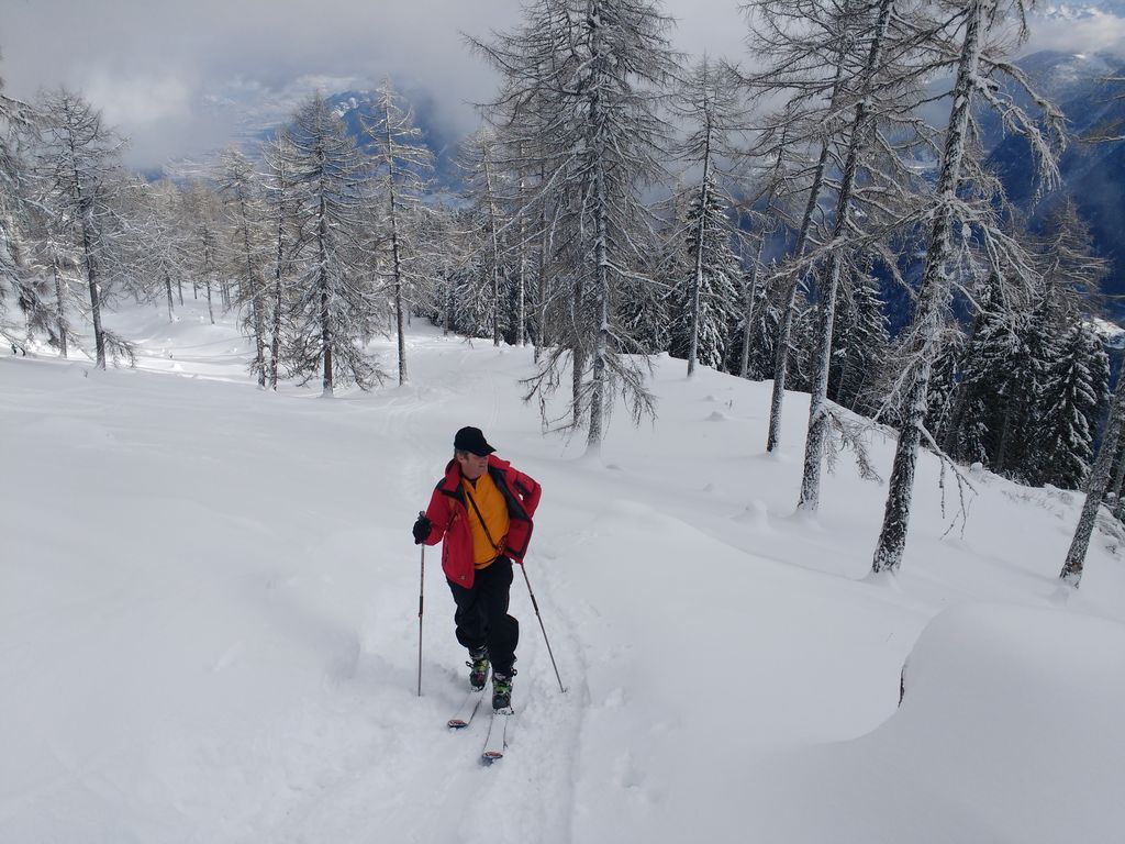 The ski down from the summit is not that challenging, but it is a delightful descent through trees and meadows. Since we chose the route as a safe option after heavy snowfall, we had plenty of light, fluffy powder to ski through on our descent. There are some steeper options at the start and finish of the route if conditions are a little more stable.